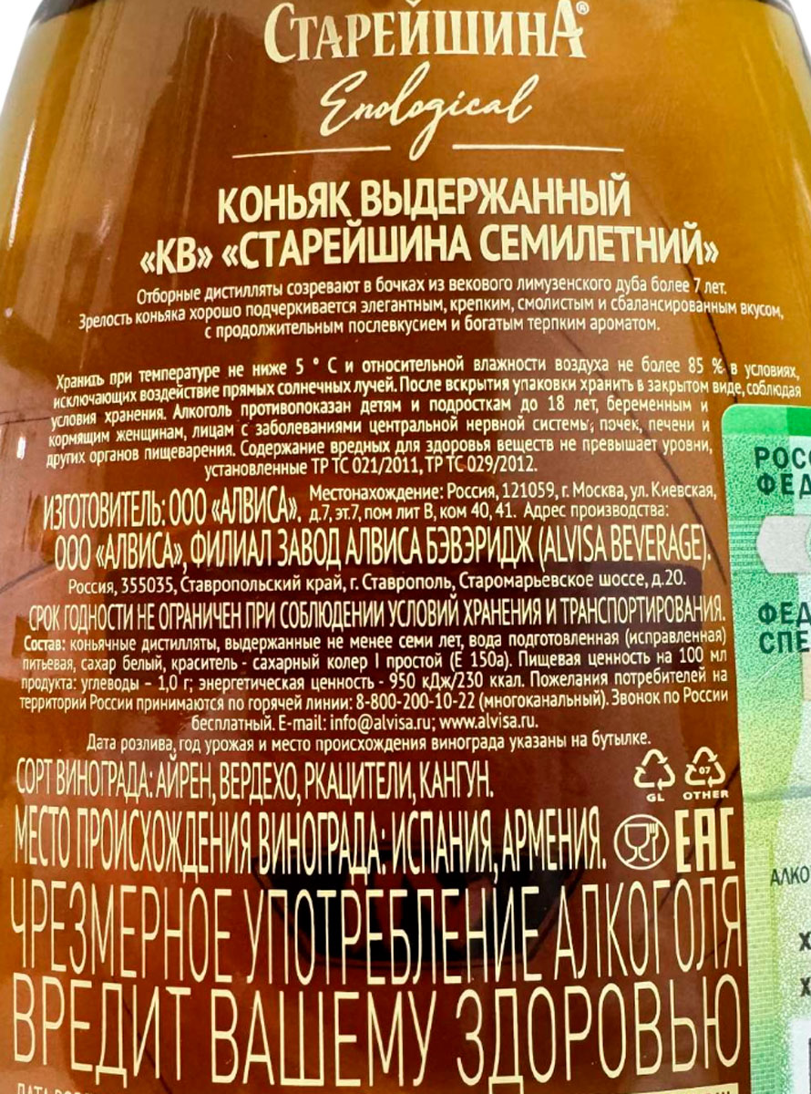 Коньяк «Старейшина» производят исключительно на основе испанского винограда, выращенного в регионе Кастилья Ла Манча (Castilla La Mancha). Отборные дистилляты созревают в бочках из векового лимузенского дуба более 7 лет. Зрелость коньяка хорошо подчеркивается продолжительным послевкусием и богатым терпким ароматом.