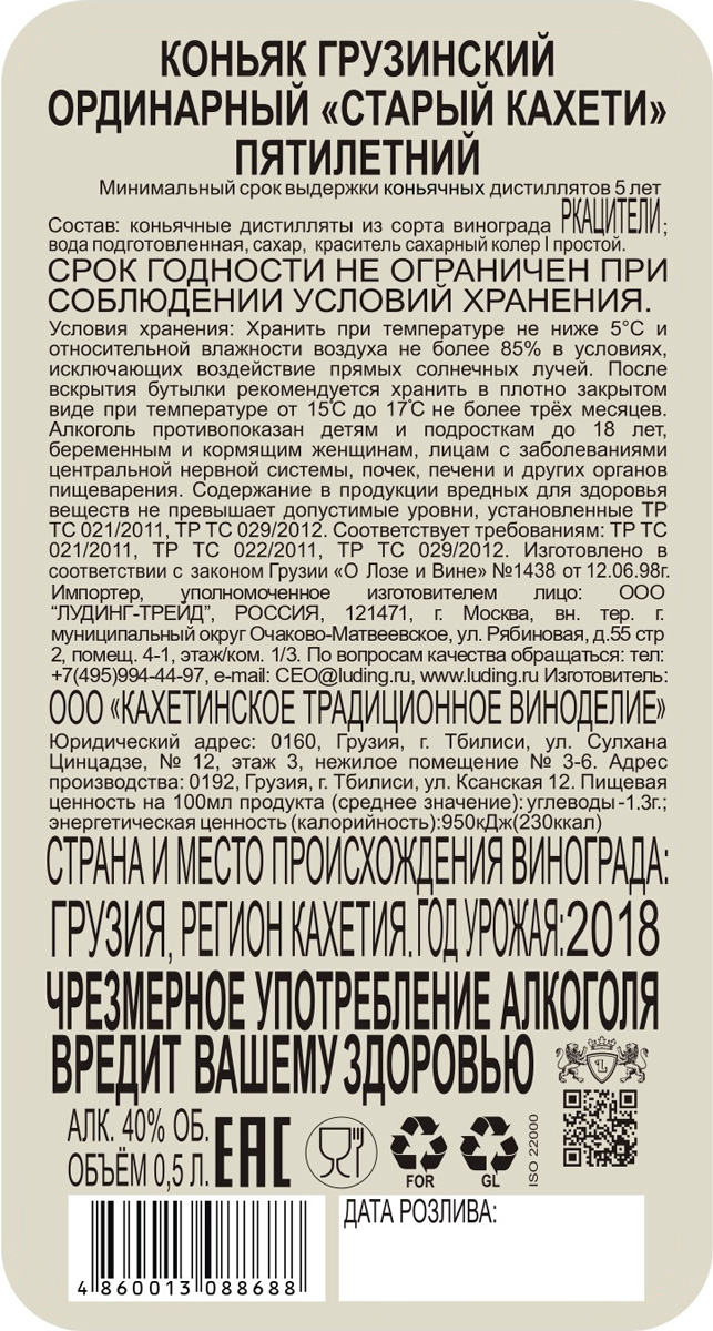 Изготовлен в Грузии из специально отобранных виноматериалов по традиционному кахетинскому методу и выдержан в грузинских дубовых бочках «Иберика». Коньяк имеет золотисто-янтарый цвет. Насыщенный плодово-цветочный аромат с приятными тонами шоколада добавляет напитку особую выразительность. Вкус коньяка гармоничный, с оттенками миндаля и меда.