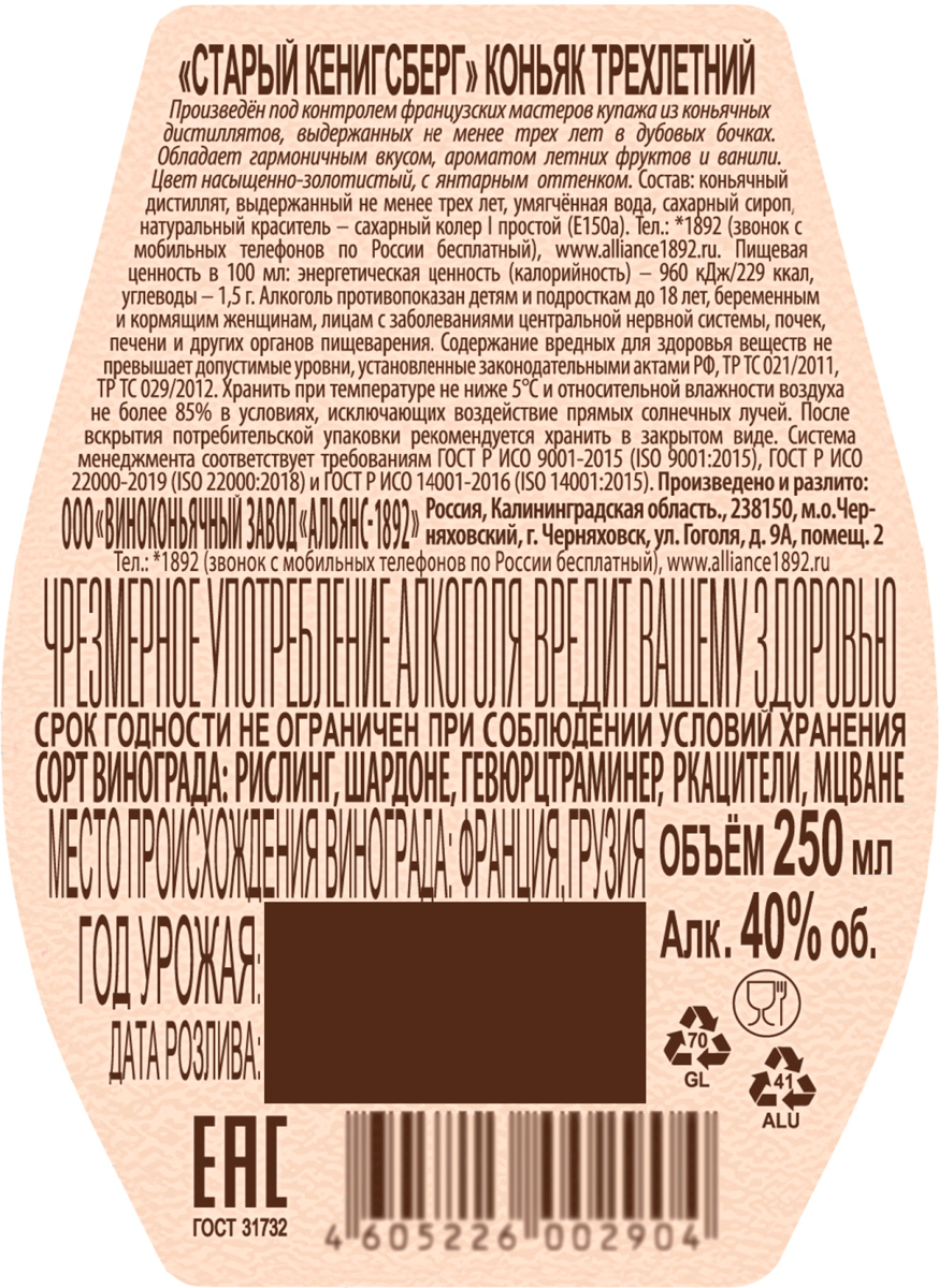 Коньяк Старый Кенигсберг 3 года