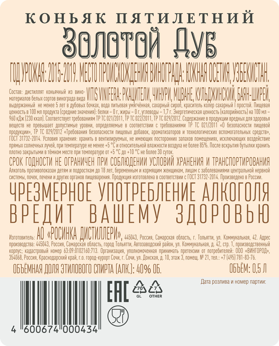 Коньяк Золотой Дуб пятилетний 0,5 л