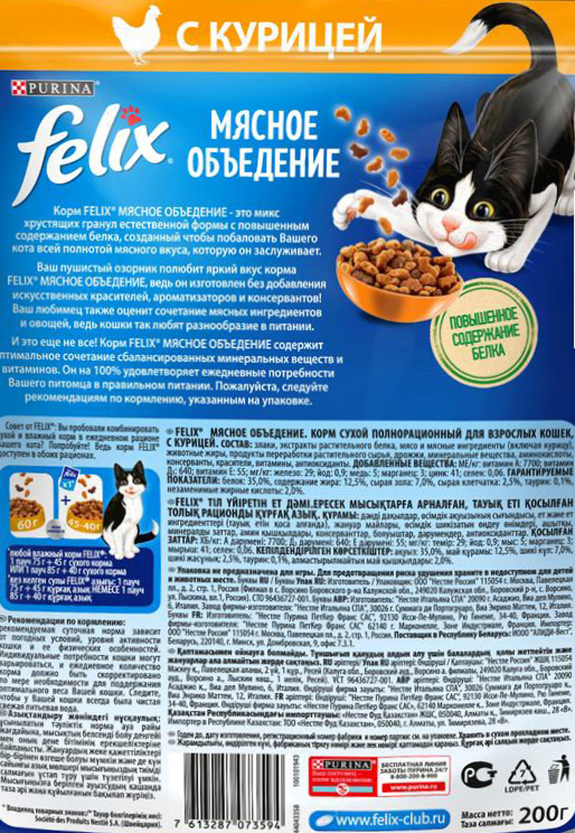 Корм Felix Мясное объедение — это микс хрустящих гранул естественной формы с повышенным содержанием белка, созданный чтобы побаловать вашего кота всей полнотой мясного вкуса, которую он заслуживает. Ваш пушистый озорник полюбит яркий вкус корма Felix Мясное объедение, ведь он изготовлен без добавления искусственных красителей, ароматизаторов и консервантов. И это еще не все! Корм Felix Мясное объедение содержит оптимальное сочетание сбалансированных минеральных веществ и витаминов. Он на 100% удовлетворяет ежедневные потребности вашего питомца в правильном питании.