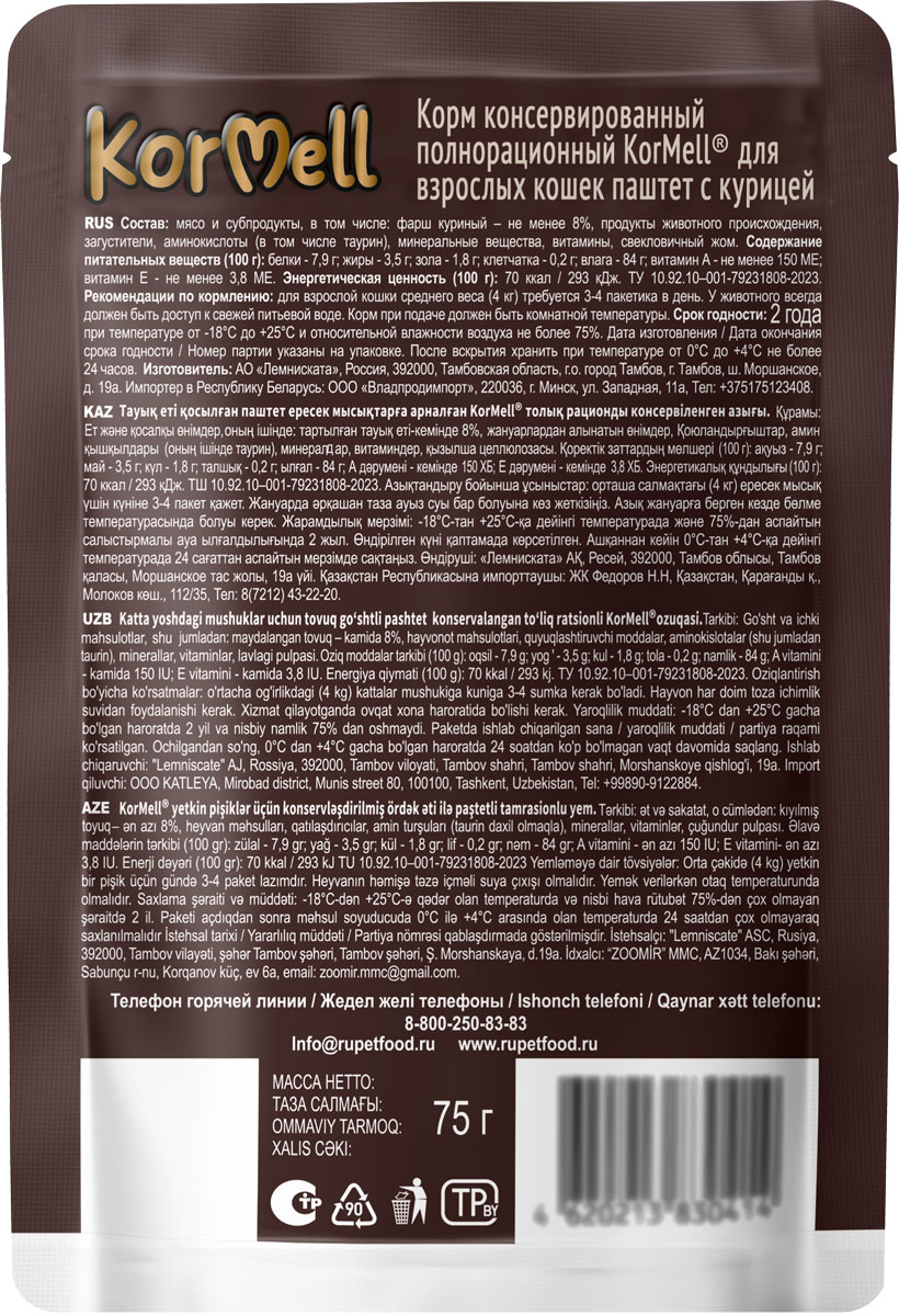 KorMell — паштетная линейка для любимых кошек: нежная, легкая, аппетитная и ароматная. Паштет содержит большое количество влаги, что помогает поддерживать водный баланс в организме животного и предотвращать проблемы с мочевыделительной системой. Это особенно важно для пушистиков, которые пьют недостаточно воды. Идеальное решение для кошек с плохим аппетитом. Нежная форма, тонкий аромат и насыщенный вкус паштета стимулируют аппетит, помогая обеспечить животное необходимым питанием.