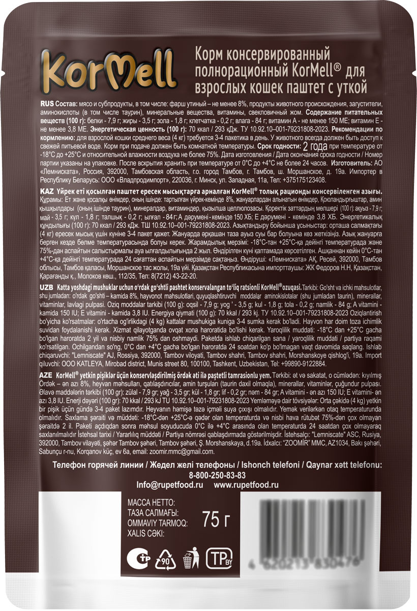 Корм KorMell с уткой паштет