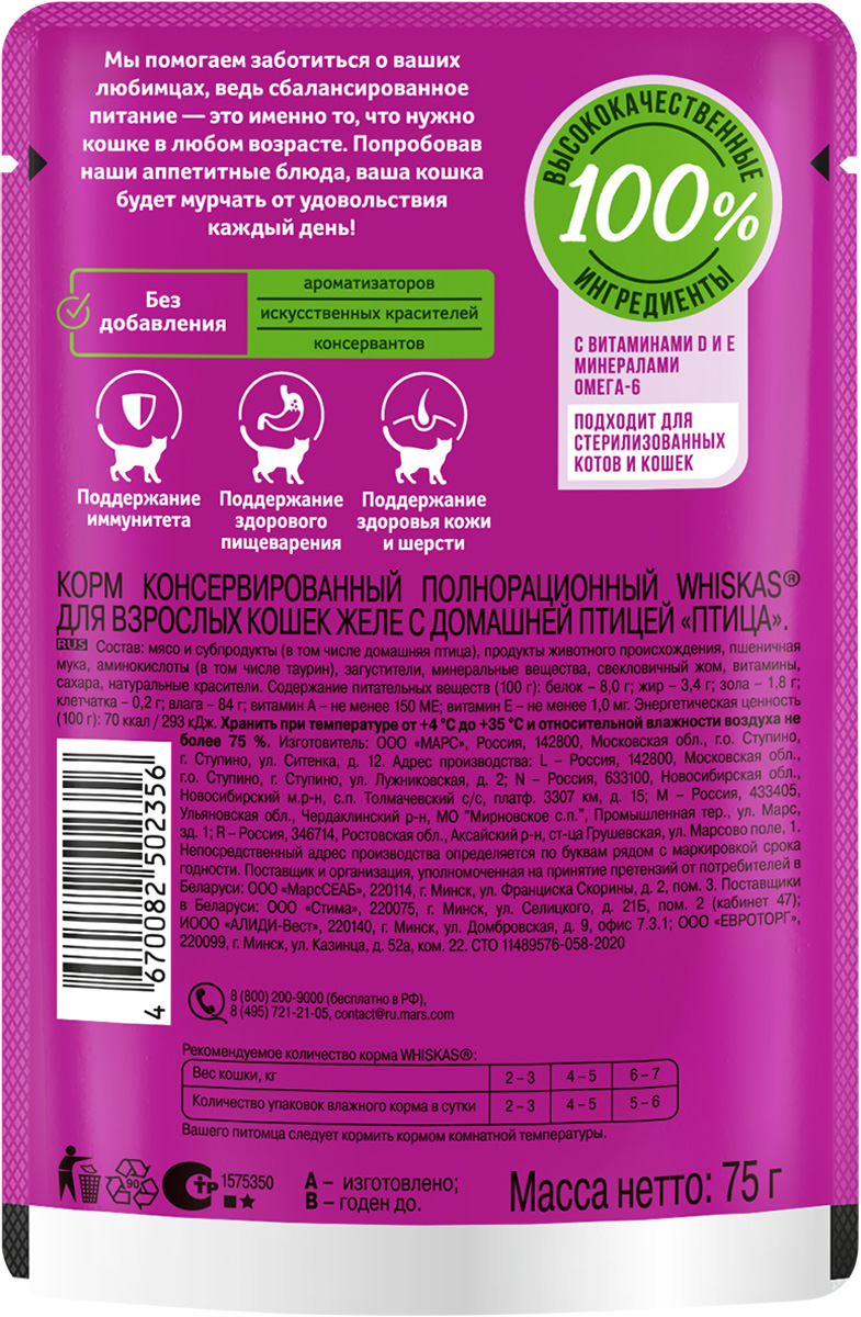 Это сбалансированный рацион, приготовленный так, как любит ваша кошка. Отборные мясные кусочки с домашней птицей в аппетитном желе придутся по вкусу вашей любимице. Жизнь замуррчательна, ведь рацион Whiskas® содержит все необходимое, чтобы еда вашей кошки была не только вкусной, но и полезной. Whiskas® поддержит иммунитет, позаботится о здоровом пищеварении и здоровье кожи и шерсти вашей кошки. Рационы Whiskas® для взрослых кошек на 100% состоят из натуральных высококачественных ингредиентов: мясо и субпродукты – без добавления ароматизаторов, искуственных красителей и консервантов, а также содержат необходимое для поддержания здоровья вашей любимицы: Омега-6, кальций, фосфор, таурин, витамины D и Е, цинк Ваша кошка будет мурчать от удовольствия! Подходит для стерилизованных котов и кошек.