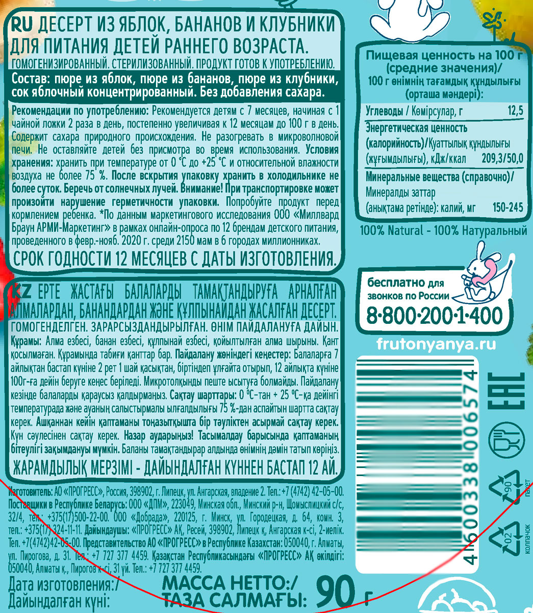 Пюре ФрутоНяня яблоко банан клубника 90 г
