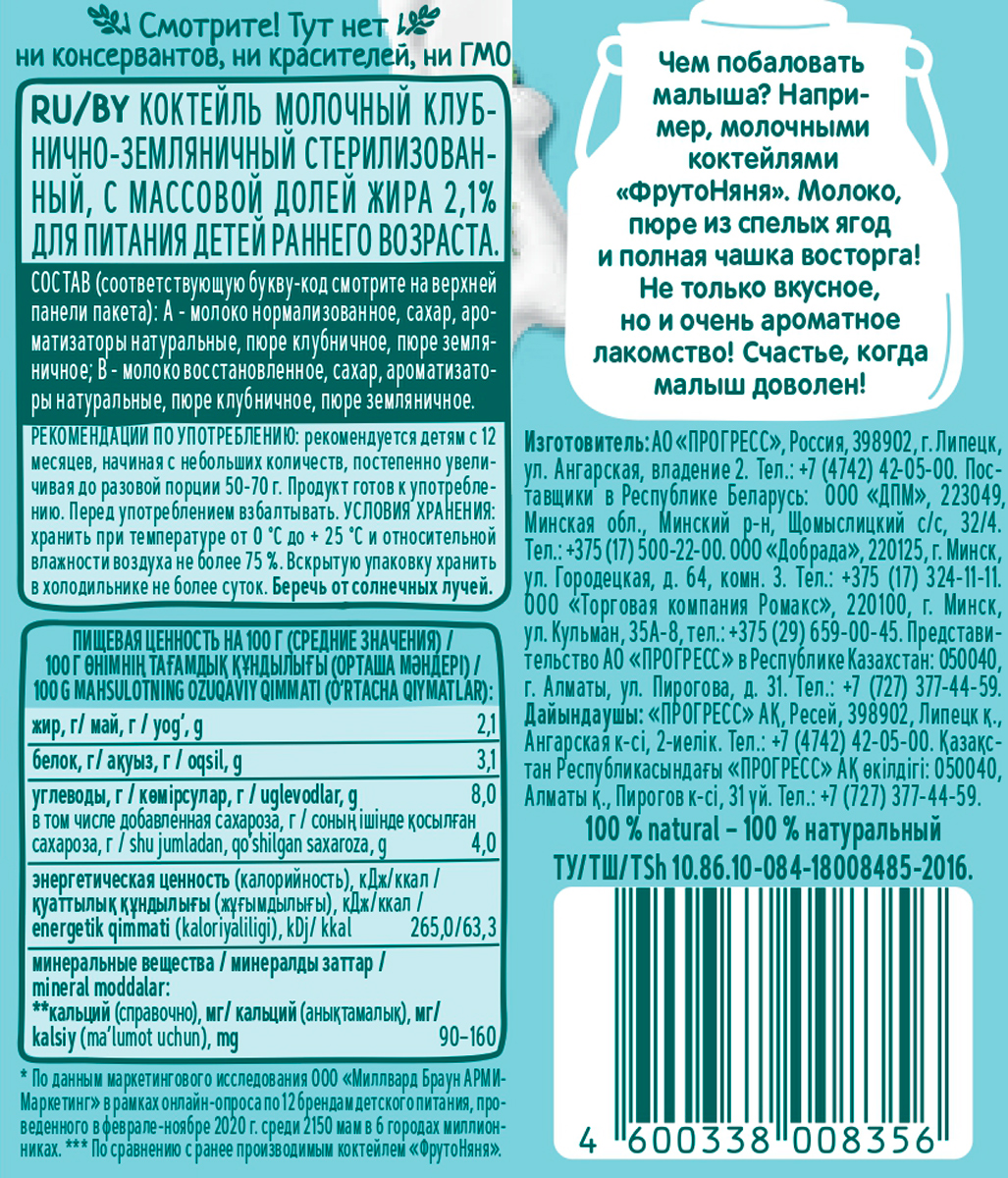 Молочные продукты — источник витаминов, минералов и питательных элементов для вашего ребенка. Молочный клубнично-земляничный коктейль «ФрутоНяня» приведет в восторг вашего малыша. Вкусный, полезный десерт в удобной упаковке сделан с заботой о детях и спокойствии родителей.