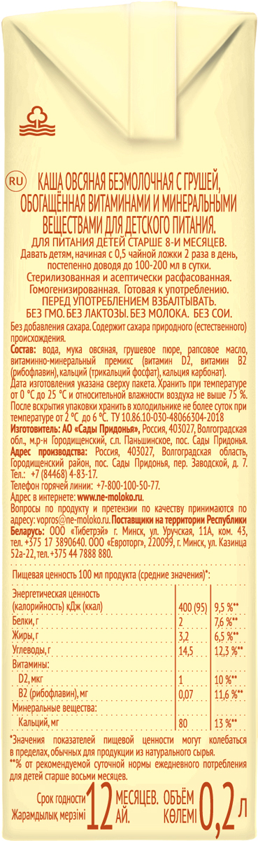 Питьевые каши удобны в использовании: их основное преимущество заключается в том, что они являются гомогенным, полезным и питательным продуктом, готовым к употреблению в любом месте и в любое время. В овсе содержатся антиоксиданты и полифенолы – биологически активные соединения, способствующие защите организма. Продукт рекомендуется к употреблению детям, начиная с 8 месяцев в качестве ежедневного прикорма. Идеально подходит для детей с аллергией на молочный белок и непереносимостью лактозы.