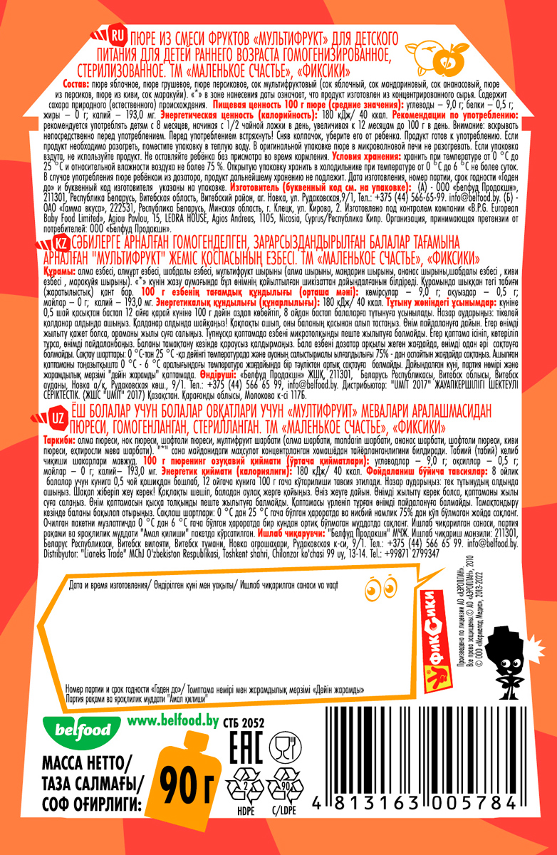 Пюре «Фиксики. Маленькое счастье» с мультифруктовым вкусом произведено только из отборных фруктов, выращенных в природоохранных зонах. Специальная нежная консистенция. Без добавления соли, сахара, консервантов, крахмала и красителей.