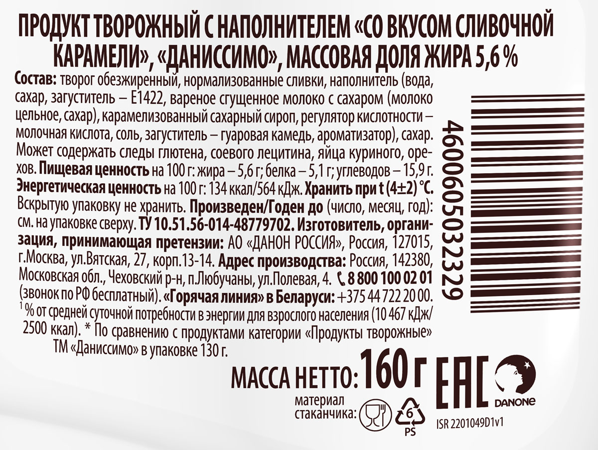 Творожок «Даниссимо» — это уникальная комбинация свежего натурального творога и сливок, благодаря чему «Даниссимо» имеет полюбившуюся многим удивительно мягкую, тающую во рту и очень нежную текстуру. Творожок со вкусом сливочной карамели подарит самые приятные эмоции и ощущения.