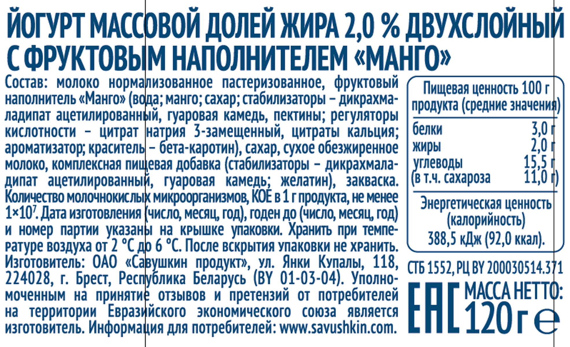 Йогурты «Савушкин» — полезные молочные десерты, изготовленные из натурального коровьего молока. Двуслойный йогурт «Савушкин» — изысканный десерт, где легкий нежный натуральный йогурт сочетается с фруктовым наполнителем. Яркий сочный тропический вкус манго никого не оставит равнодушным. Чтобы получить неповторимый молочно-фруктовый вкус, нужно просто перемешать йогурт! Добавить экзотики в повседневную жизнь просто — возьмите с собой йогурт «Савушкин» с манго в качестве перекуса или зарядитесь солнечной энергией манго на завтрак.