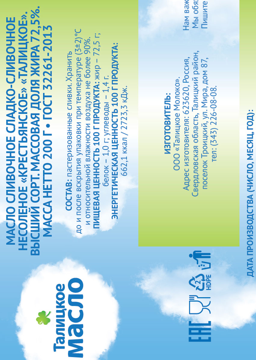 Масло сливочное Талицкое 72,5%