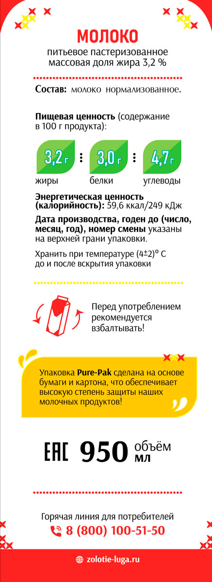 Пастеризованное молоко «Золотые луга» производится только из натурального продукта. Именно поэтому оно обладает невероятно нежным сладковато-молочным вкусом и тонким естественным ароматом. Отличный источник белка, необходимых аминокислот и кальция.
