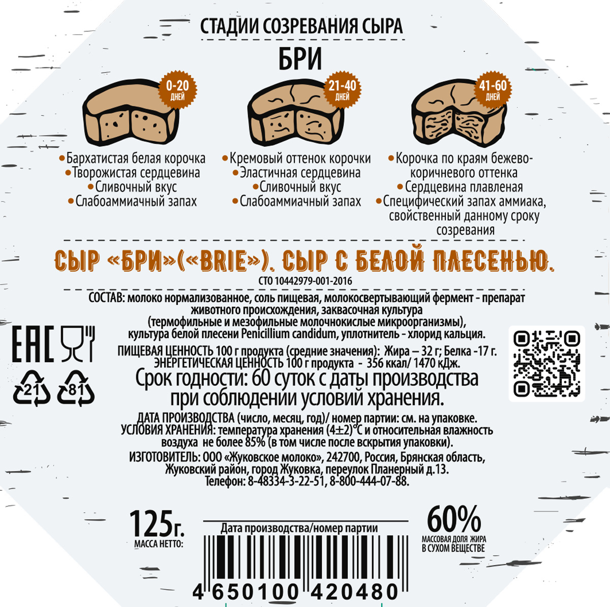Сыр Бри Из Жуковки с белой плесенью 60% 125 г