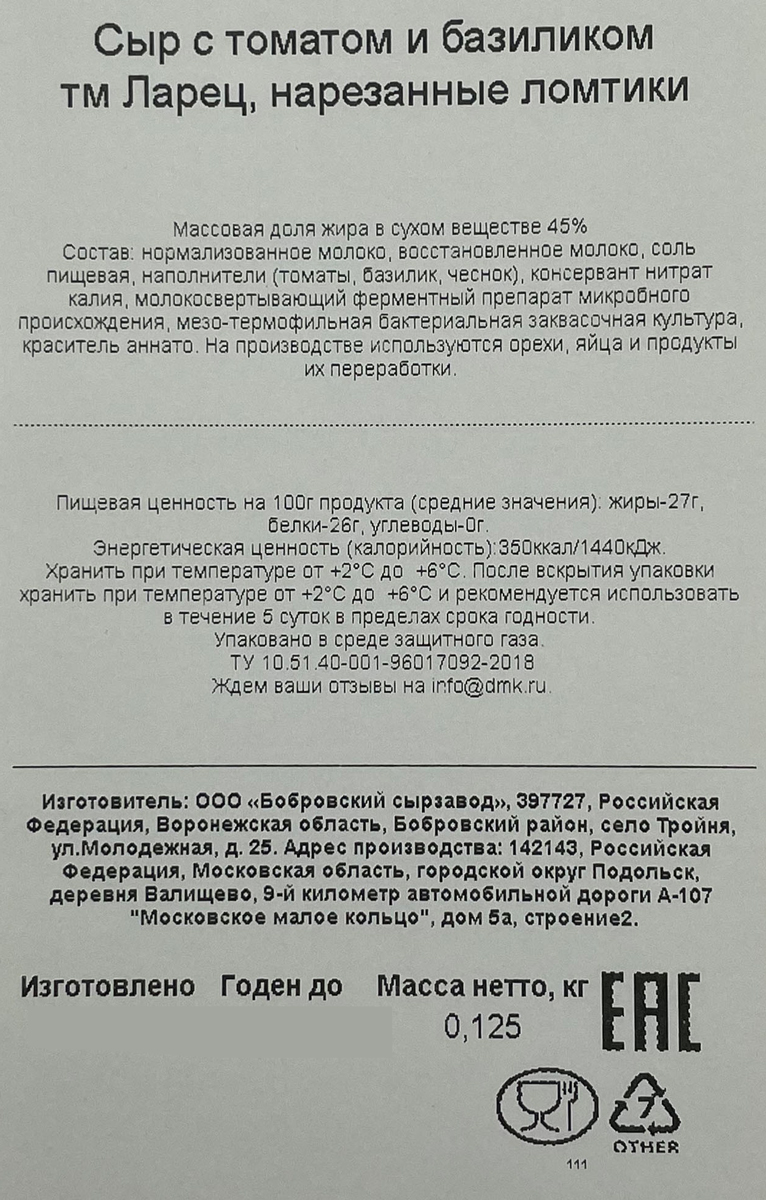 Сыр Ларец с томатом и базиликом 45%