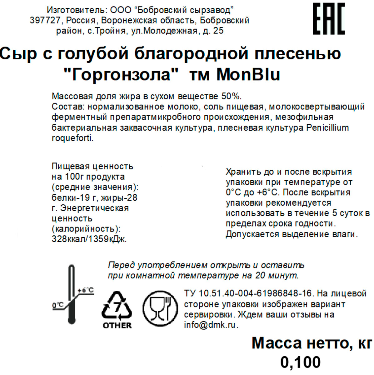 Горгонзола MonBlu обладает мягкой текстурой с голубовато-зелёными прожилками плесени и пикантным, слегка островатым вкусом. Идеально подходит для приготовления горячих блюд, в качестве компонента для соусов, а также для сырных тарелок.