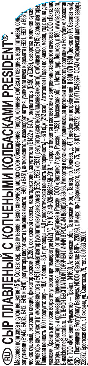 Плавленый сыр President с копчеными колбасками создан для сырных гурманов. Обладает насыщенным вкусом и содержит кусочки мяса. Сыр изготовлен из высококачественного полутвердого сыра с добавлением натурального творога, не содержит растительных жиров и искусственных красителей.