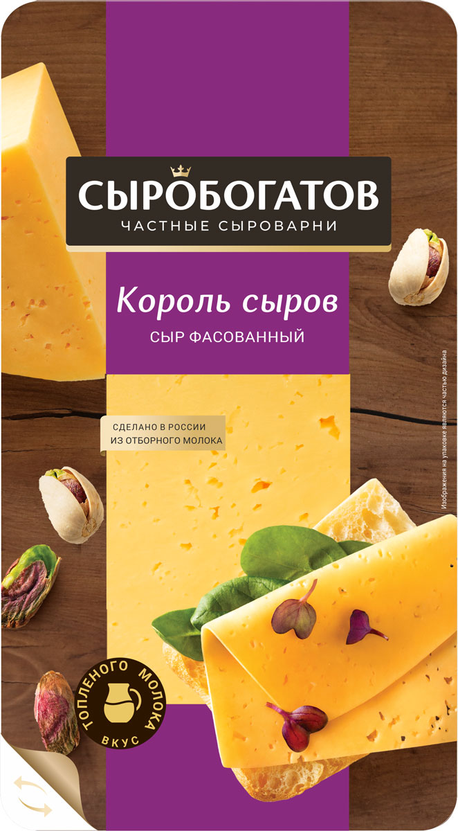 При производстве сыров «Сыробогатов» используется натуральное высококачественное сырье, прошедшее специальный отбор. Высокое качество сыров достигается благодаря ответственному подходу к выбору сырья, соблюдению технологий производства и хранения сыра. Король сыров – Оригинальный сорт. Имеет своеобразный утонченный вкус топленого молока. Цвет теста нежно-желтый.