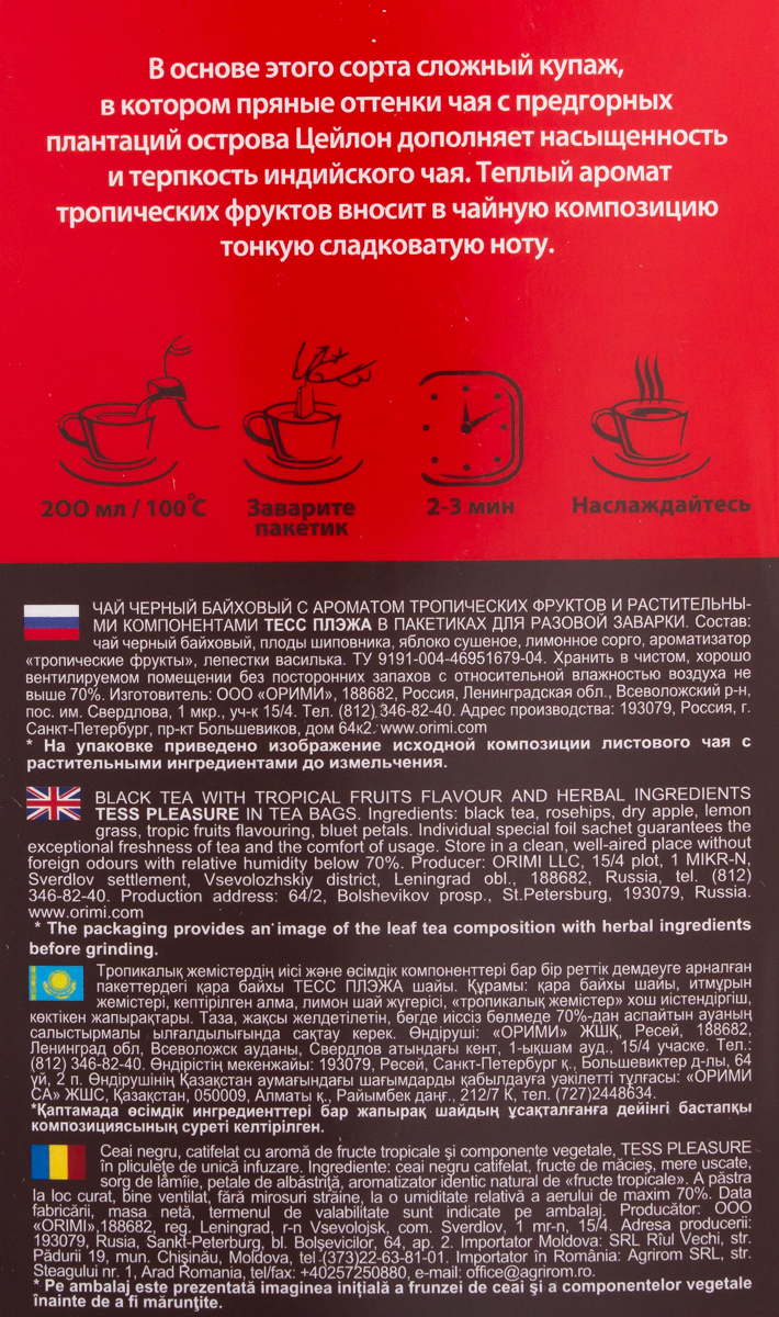 В основе TESS Pleasure сложный купаж, в котором пряные оттенки чая с предгорных плантаций острова Цейлон дополняют насыщенность и терпкость индийского чая. Индивидуальная упаковка в термосаше из специальной фольги гарантирует исключительную свежесть чая и удобство использования.