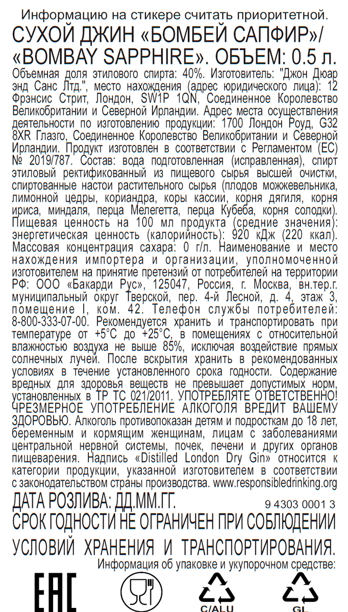 Джин Бомбей Сапфир 0,5 л