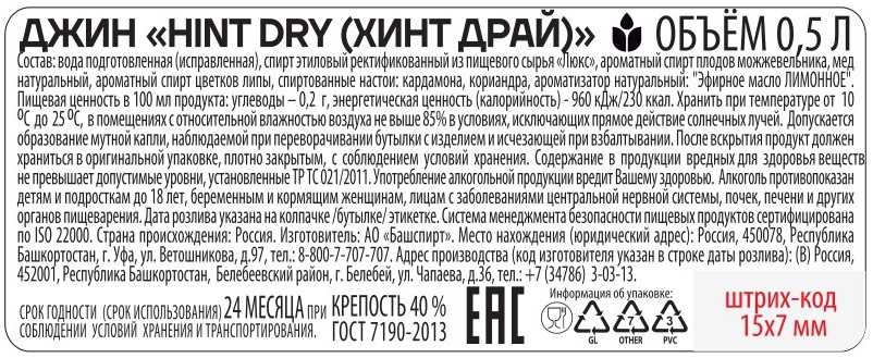 Джин Хинт Ориджинал 0,5 л
