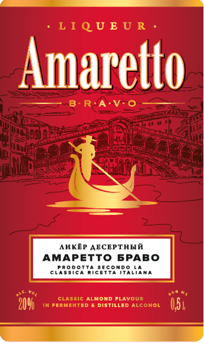AMARETTO BRAVO — напиток любви, сочетающий в себе богатую гамму самых различных оттенков: сладость и легкую горечь, нежность и изысканность. Классический вкус горького миндаля дополнен вкусом спелой вишни, придающим напитку изящную тонкость.