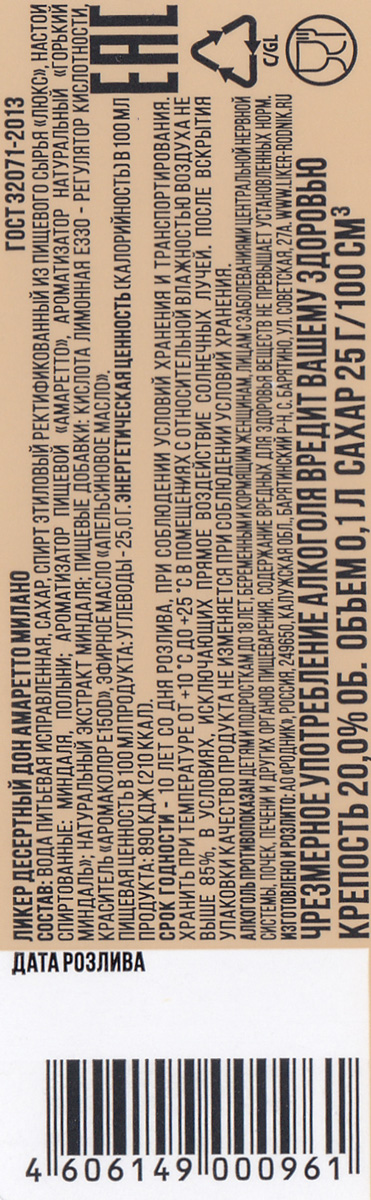 ДОН АМАРЕТТО МИЛАНО — напиток страсти, сочетает в себе богатую гамму самых различных оттенков: сладость и легкую горечь, нежность и изысканность. Во вкусе явно преобладает горький миндаль, что обеспечивает напитку цельный гармоничный вкус.