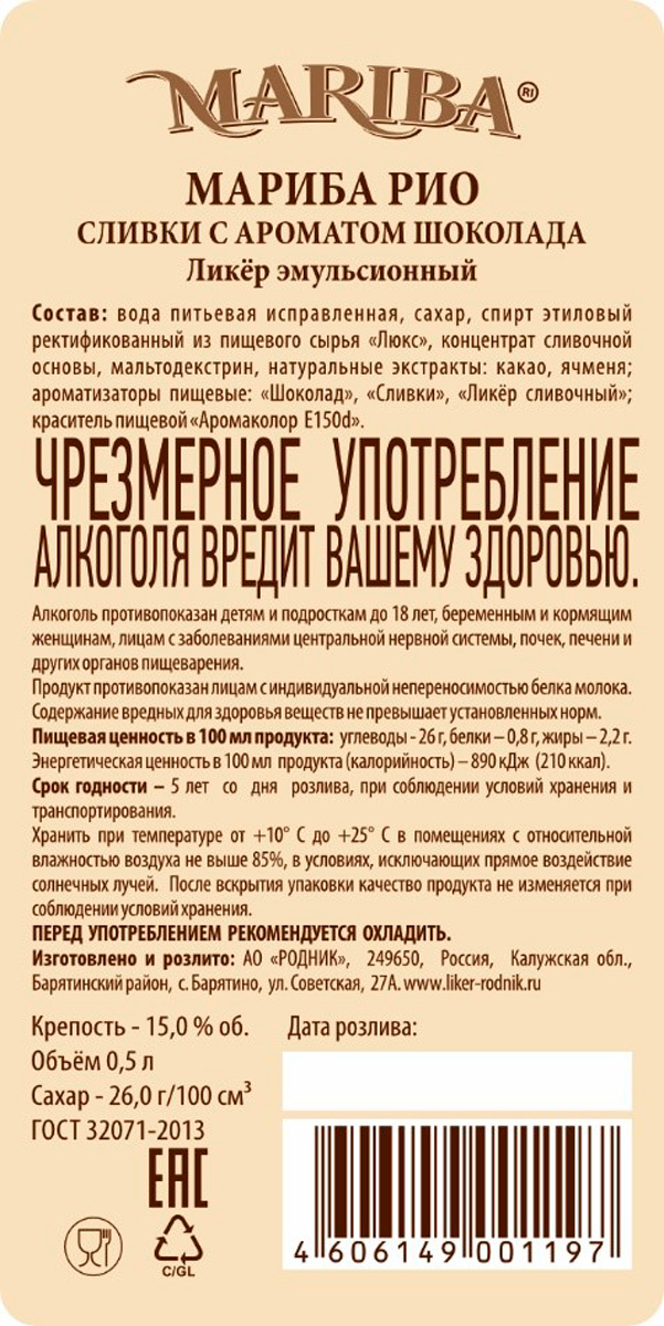 Ликер Мариба Рио сливки с ароматом шоколада 0,5 л