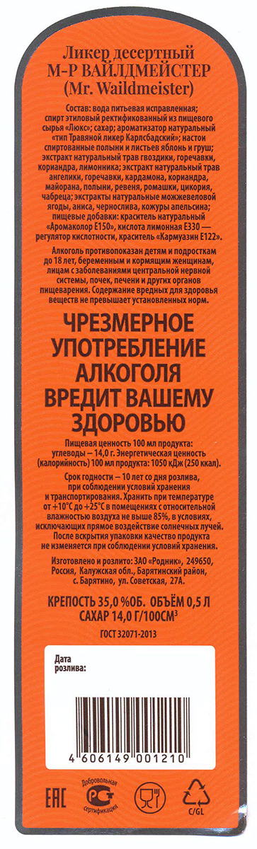 Mr. Waildmeister — пикантный напиток на травах. Имеет горьковатый вкус. В состав ликера входит множество трав, среди которых натуральный экстракт гвоздики, кориандра, майорана, полыни, ревеня, ромашки, цикория, чабреца, имбиря, шафрана и других трав. Употребляют ликер в чистом виде, залпом, предварительно охладив. Холодным ликер становится более тягучим и сладким. Алкоголь при этом не ощущается, а вот аромат трав раскрывается по-новому. Напиток идеален в качестве аперитива.