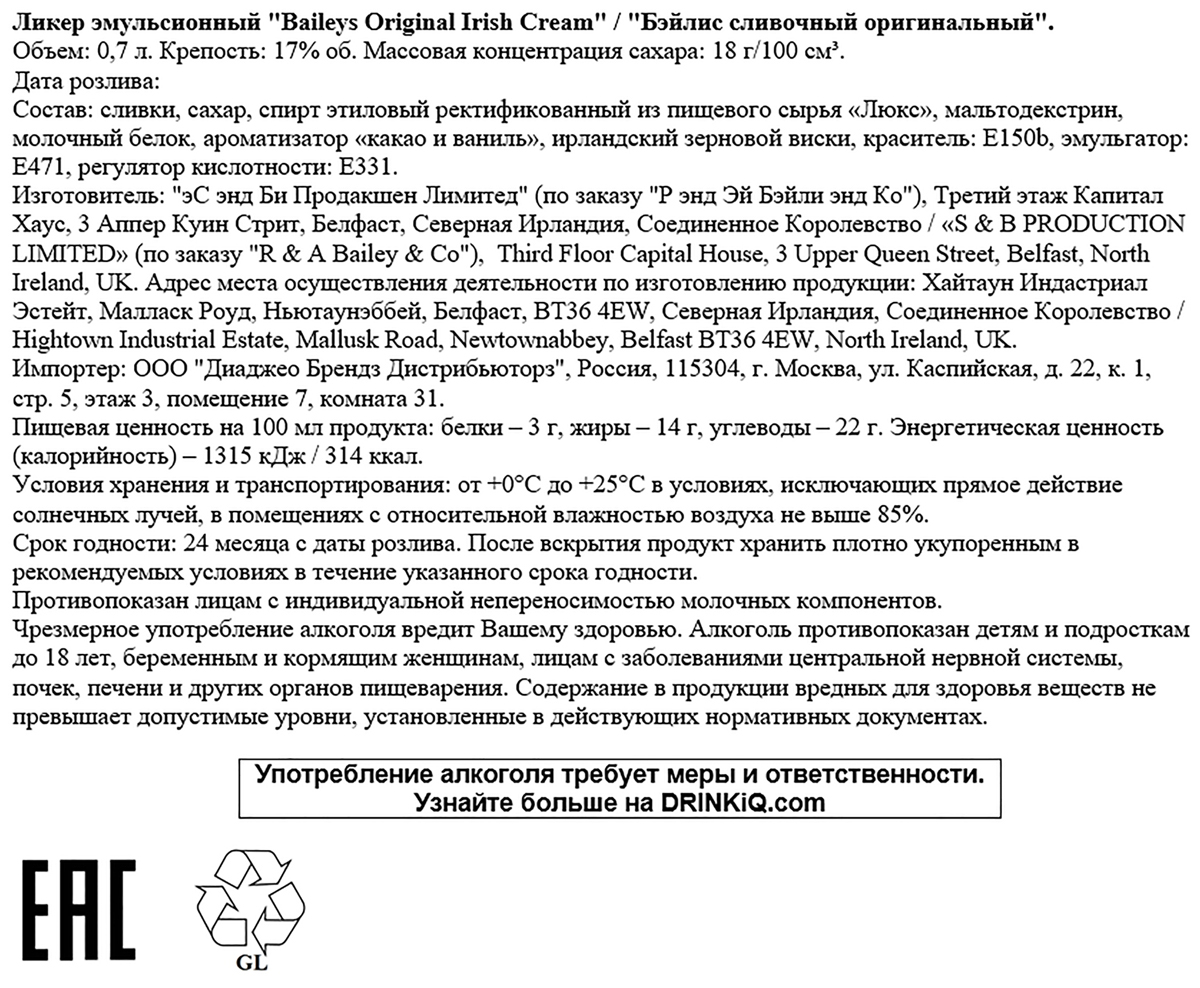 Ликер эмульсионный Бэйлис сливочный оригинальный 0,7 л