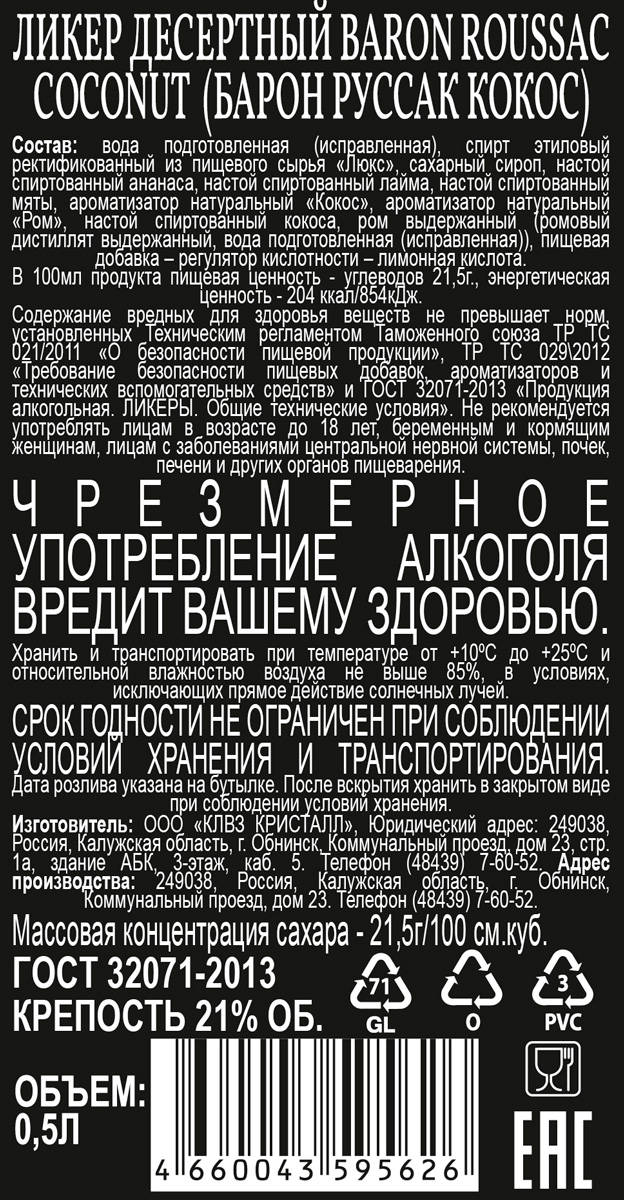 Ликер создан на основе белого карибского рома. Потрясающие вкусовые качества и нежнейшая кремовая структура. Экзотический вкус, умеренная сладость и небольшая крепость (21%) делают ликер отличным ингредиентом для авторских коктейлей. Также напиток — хорошее дополнение к содовой и соку.