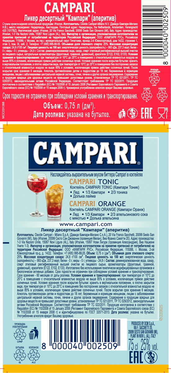 CAMPARI — аперитив на основе горьких трав, ароматических растений и цитрусовых, созданный в 1861 году Гаспаре Кампари в Милане. Состав напитка до сих пор хранится в строгом секрете. Обладая вибрирующим красным цветом, интенсивным ароматом и выразительным вкусом, Campari всегда был символом интриги и удовольствия. Употребляется в качестве аперитива в составе всемирно известных коктейлей, таких как Negroni, Americano, Campari Tonic. Попробуйте и вы икону безупречного итальянского стиля!