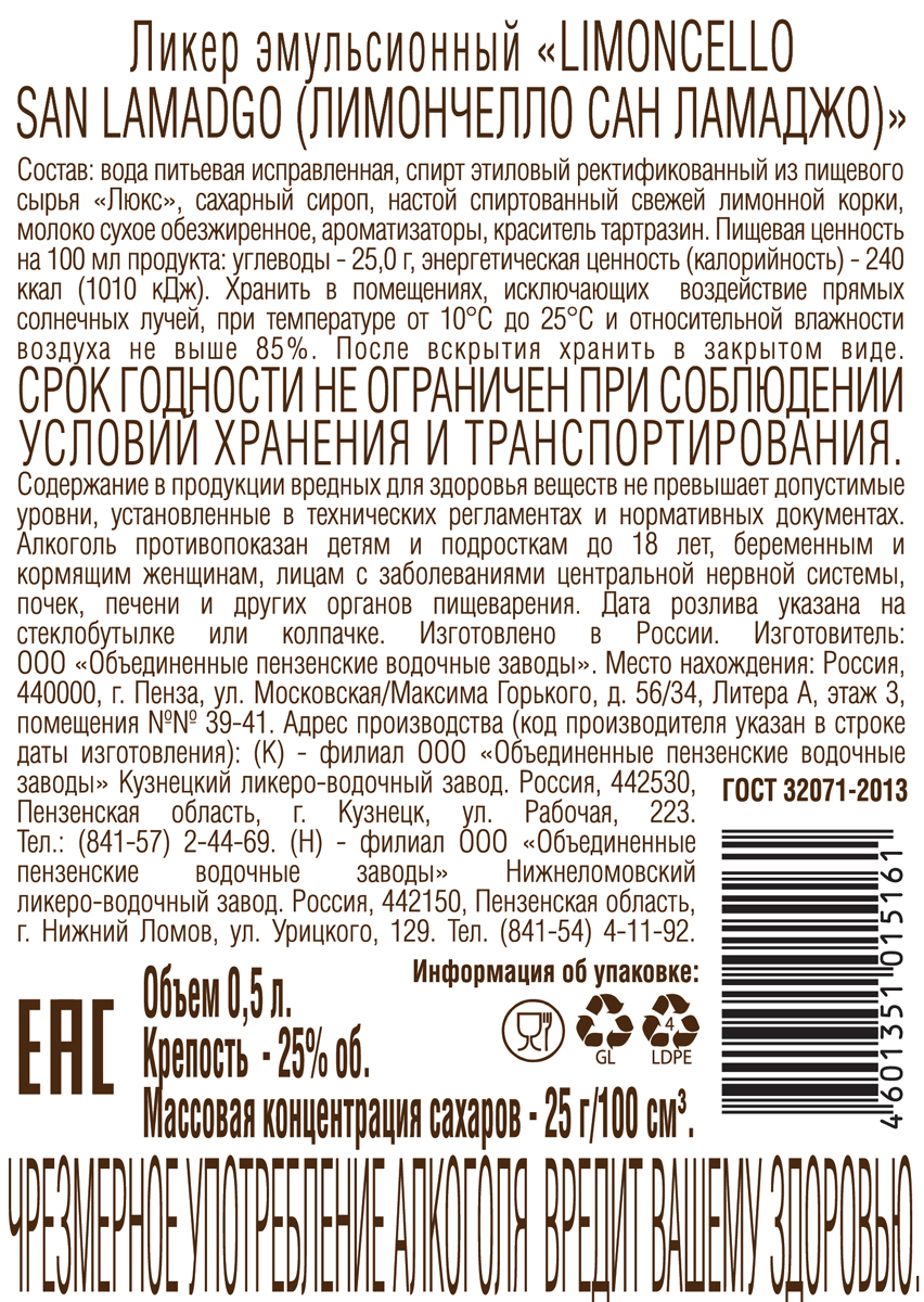 Ликер эмульсионный Limoncello San Lamadgo — это традиционный ликер, произведенный по технологии Италии. Производится из цедры спелых лимонов, настоянных на спирту, что дает насыщенно-лимонный вкус и аромат свежих цитрусовых. Вкус ликера отличается характерной насыщенностью спелых лимонов в сочетании с приятной мягкостью и легкой освежающей горчинкой. В производстве используется настой кожуры лимонов. В аромате ликера раскрывается богатый цитрусовый букет свежих лимонных корочек. Лимончелло – классический дижестив, его подают после еды – он улучшает пищеварение и отлично очищает рецепторы от тяжелых вкусов жареной и жирной пищи.