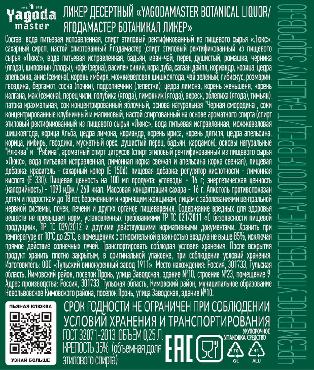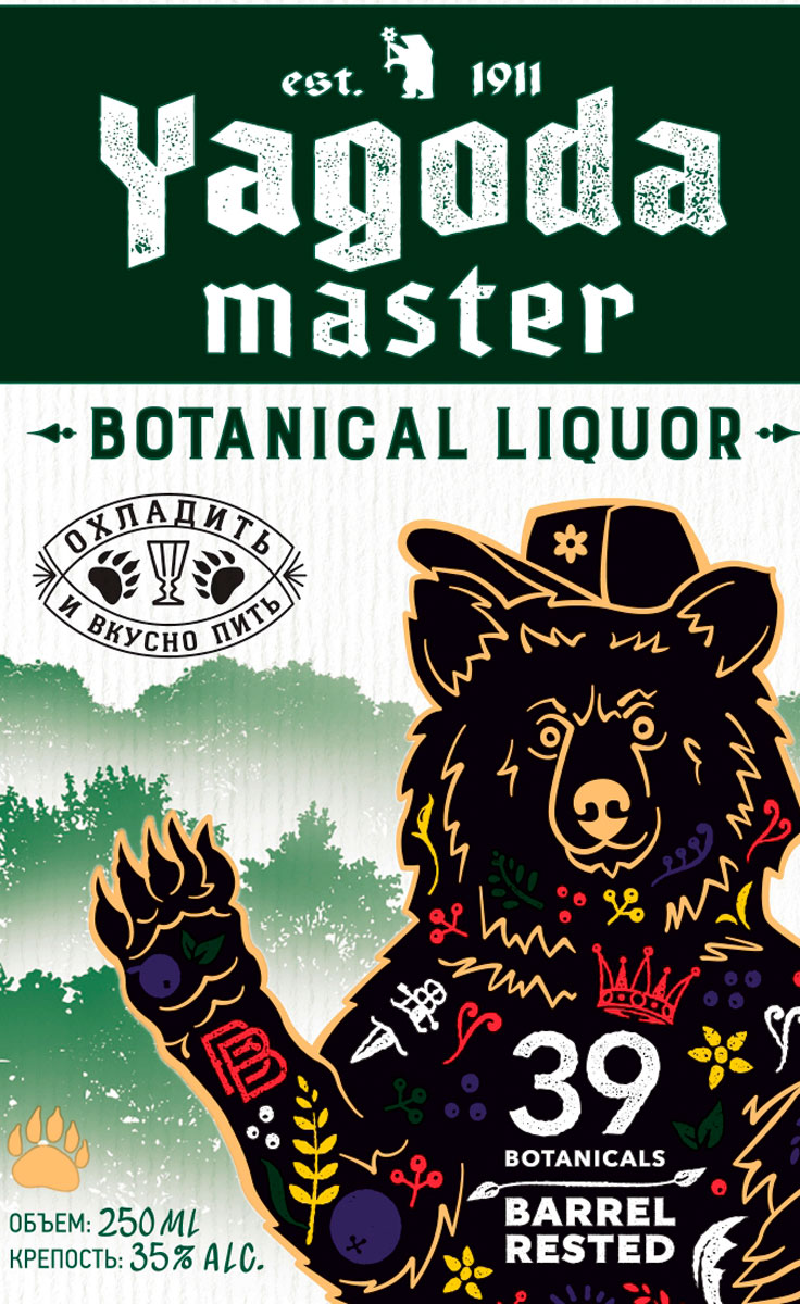 В состав ликёра «Ягодамастер» входят 39 трав и ягод, все они собраны в России. Настой из ботаникалов выдерживается в контакте с дубом не менее 20 дней, так ликёр приобретает максимально насыщенный вкус и аромат с нотами сухих лечебных трав, бадьяна, зубровки и мяты. Вкус больше ягодный, чем травяной, отсюда и название «Ягодамастер». Отличный баланс: перечная острота компенсирует горечь. Земляничное послевкусие смягчает остроту. Персонаж ликёра «Ягодамастер» — медведь, хозяин русского леса. На бутылке проявится лапка медведя, если ликёр охладился до оптимальной температуры. В охлаждённом ликёре ярче ощущается его удивительный ягодно-травяной вкус. Охладить и вкусно пить!