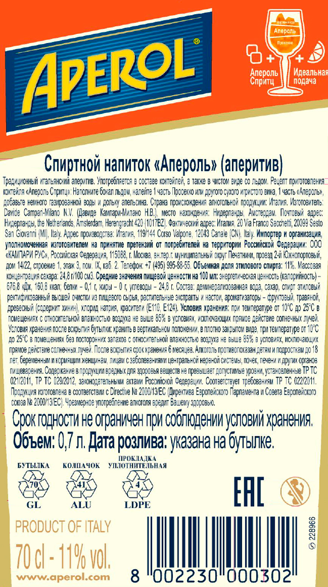 Aperol — итальянский аперитив с горьковато-сладким вкусом. Состав ингредиентов легендарного напитка хранится в секрете и остается неизменным более 100 лет. Aperol является главным компонентом коктейля Aperol Spritz. Рецепт Aperol Spritz: Наполните бокал льдом, добавьте 3 части просекко, 2 части Aperol и 1 часть газированной воды. Украсьте коктейль долькой апельсина.