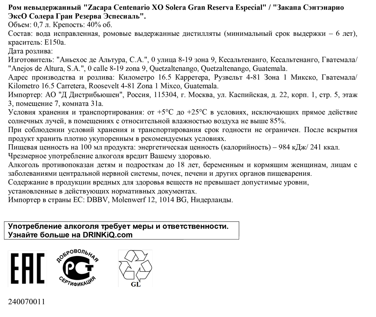 Ром создан в честь столетия Zacapa. Это настоящий шедевр искусства купажирования. Великолепное сочетание сладости, фруктов, пряности и алкоголя для самого искушенного знатока рома. Он создан в Гватемале, родине древних народов Майя. Изготавливается из меда сахарного тростника первого отжима и выдерживается в высокогорных районах на высоте 2300 метров над уровнем моря. Zacapa XO включает в себя все процессы производства Zacapa 23. Добавлен только один этап. Ром выдерживают еще 2 года в дубовых бочках, в которых не менее 10 лет выдерживался французский коньяк. Цвет: красное дерево с зелеными бликами от долгого старения в бочке на поверхности, длинные маслянистые «ноги». Вкус: полный баланс сладости, фруктов, специй и крепости, темный шоколад с вишней, сухофрукты, гвоздика, ваниль и корица, легкие ароматы сушеного манго и малины с намеком на имбирь. Аромат: открытый богатый аромат. Обожженный дуб, жженая карамель, жареные орехи, марципаны и апельсиновые корки; тонкие цветочные ноты жимолости на заднем плане. Подавать в коньячной рюмке или бокале тюльпановидной формы. Как альтернатива коньяку употребляется в соответствии с традицией.