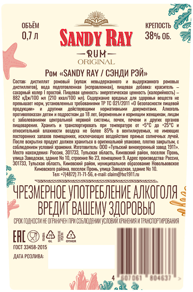 Ром Сэнди Рэй 0,7 л