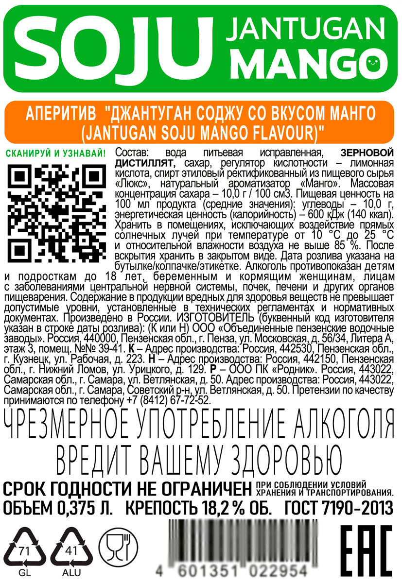 Аперитив Джантуган Соджу манго 0,375 л