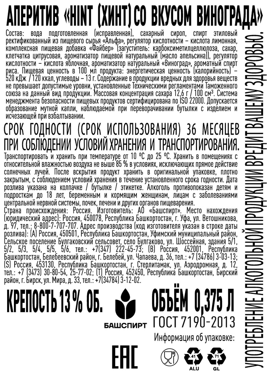 Аперитив Хинт Соджу виноград 0,375 л