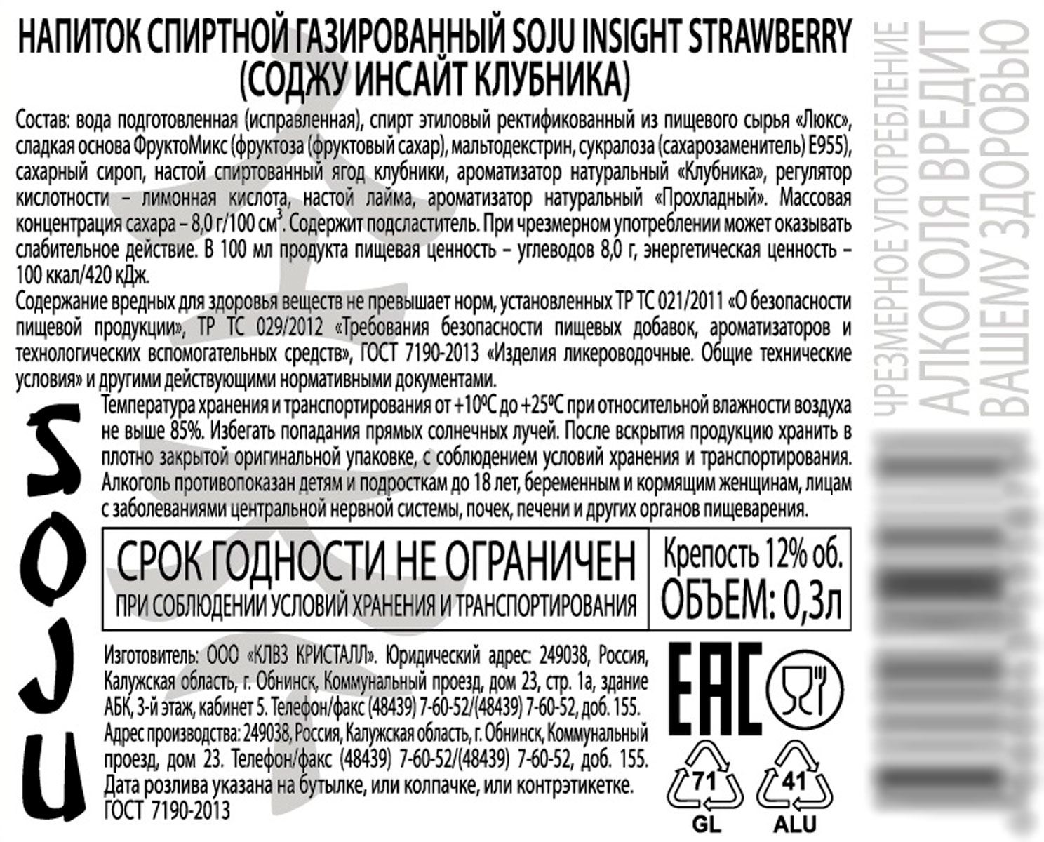 Ароматный газированный напиток прозрачного цвета с обволакивающей сладостью и мягким, гармоничным послевкусием с нотками спелой клубники. Напиток производится на основе спирта класса «Люкс» и воды с добавлением сладкой основы ФруктоМикс, спиртованных настоев клубники и лайма, натуральных ароматизаторов. Характерные спиртовые тона в аромате соджу смягчены нотками спелой клубники. Вкус аперитива мягкий, гармоничный, сладковатый, с ягодными тонами, оттенками клубничной жевательной резинки и долгим послевкусием. Рекомендуется подавать в качестве аперитива, в чистом виде или со льдом, а также его можно использовать в составе коктейлей.