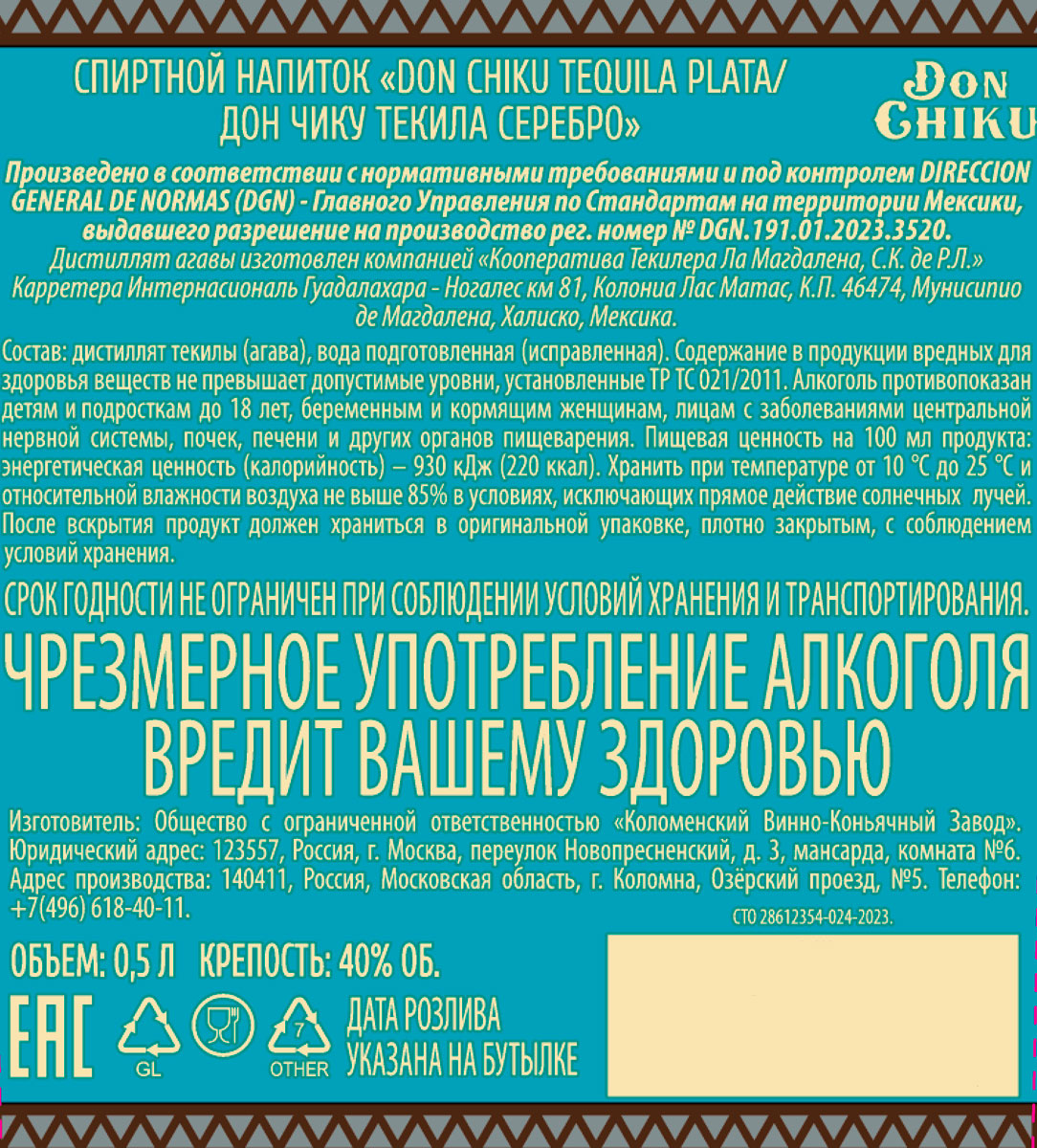 Напиток спиртной Дон Чику Текила Серебро 0,5 л