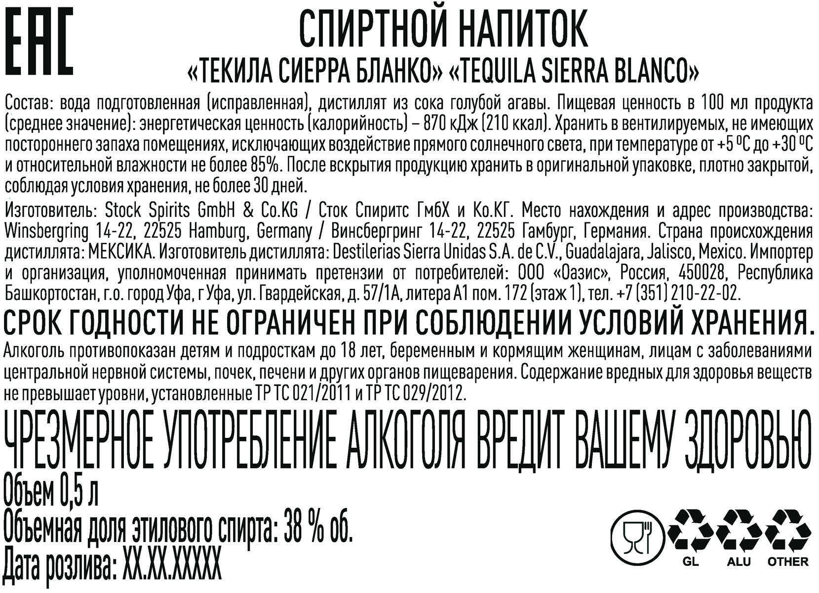 Напиток спиртной Текила Сиерра Бланко 0,5 л