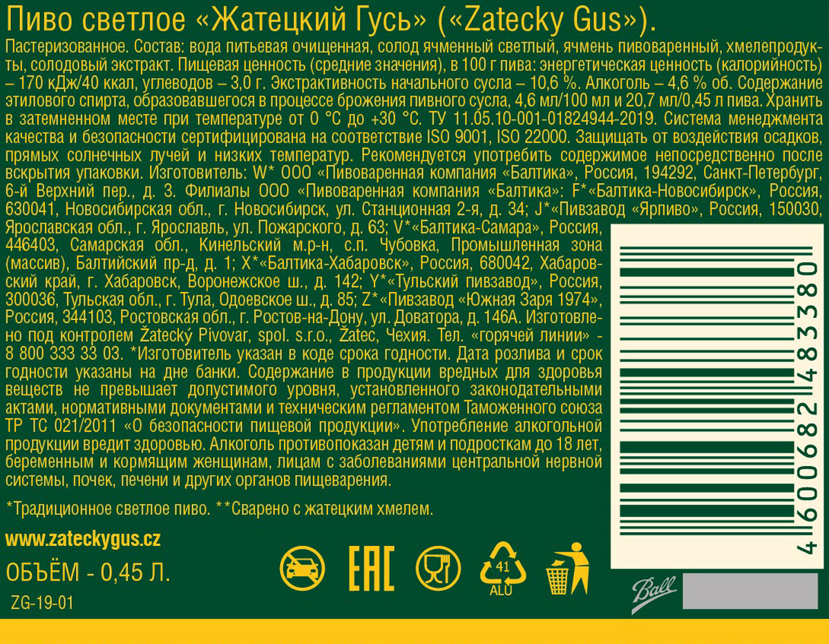 Zatecky Gus — это традиционное светлое пастеризованное пиво, сваренное по оригинальной рецептуре с добавлением знаменитого чешского ароматного хмеля сорта Жатецкий, который является одним из самых высококачественных. Его использование придает пиву особенный аромат и легкую горчинку, при этом оно легко пьется.