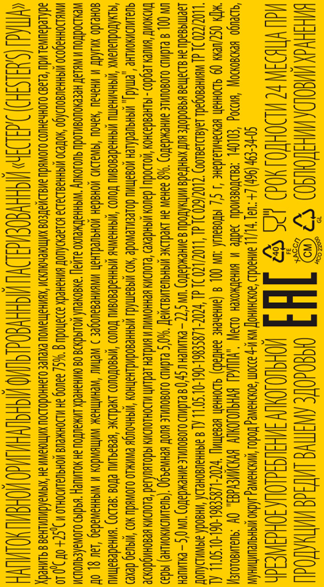 «Честер'с Груша» производится методом сбраживания натуральных соков из фруктов. Рекомендуется охладить перед подачей.