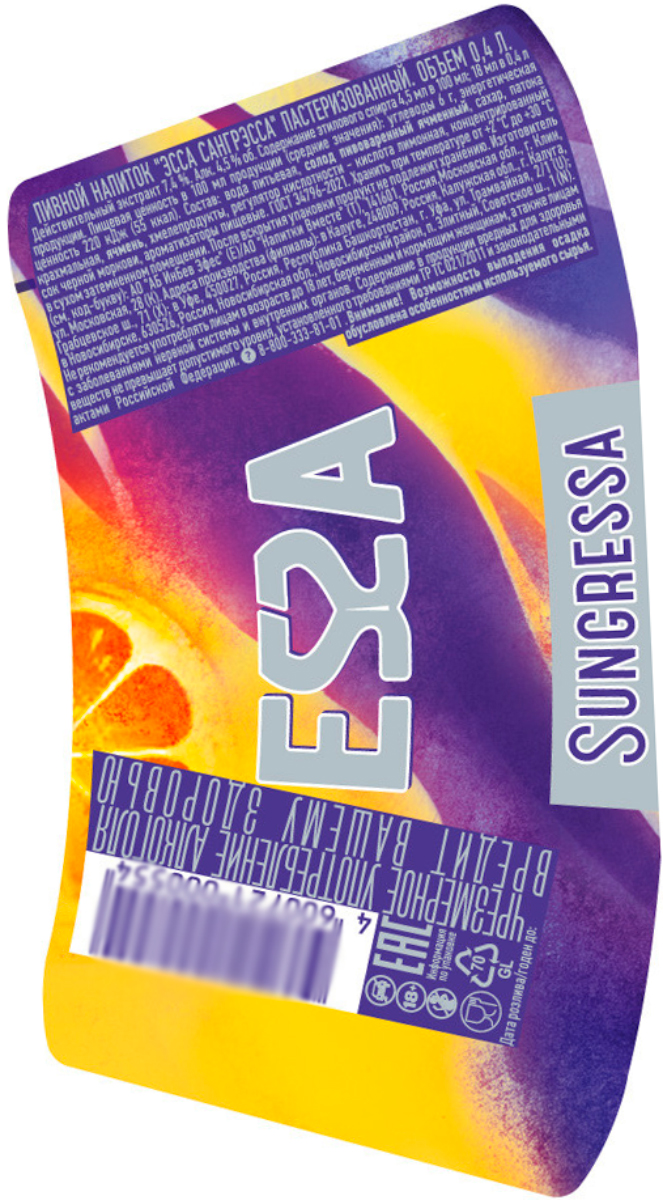 Essa – лидер сегмента фруктового пива. Был запущен в 2010 году. Содержит как классические пивные ингредиенты, такие как ячменный солод и хмель, так и натуральные ароматизаторы «апельсин», «клубника», «виноград», придающие непревзойденный вкус и аромат. Essa Sungressa – солнечно-виноградная феерия, вдохновленная испанской сиестой! Нотки винограда в дуэте с сочной мякотью апельсина и фирменным терпким послевкусием.