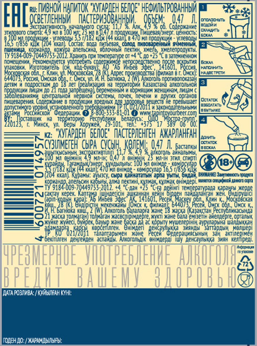 Напиток пивной Хугарден Белое светлое ст 0,44 л