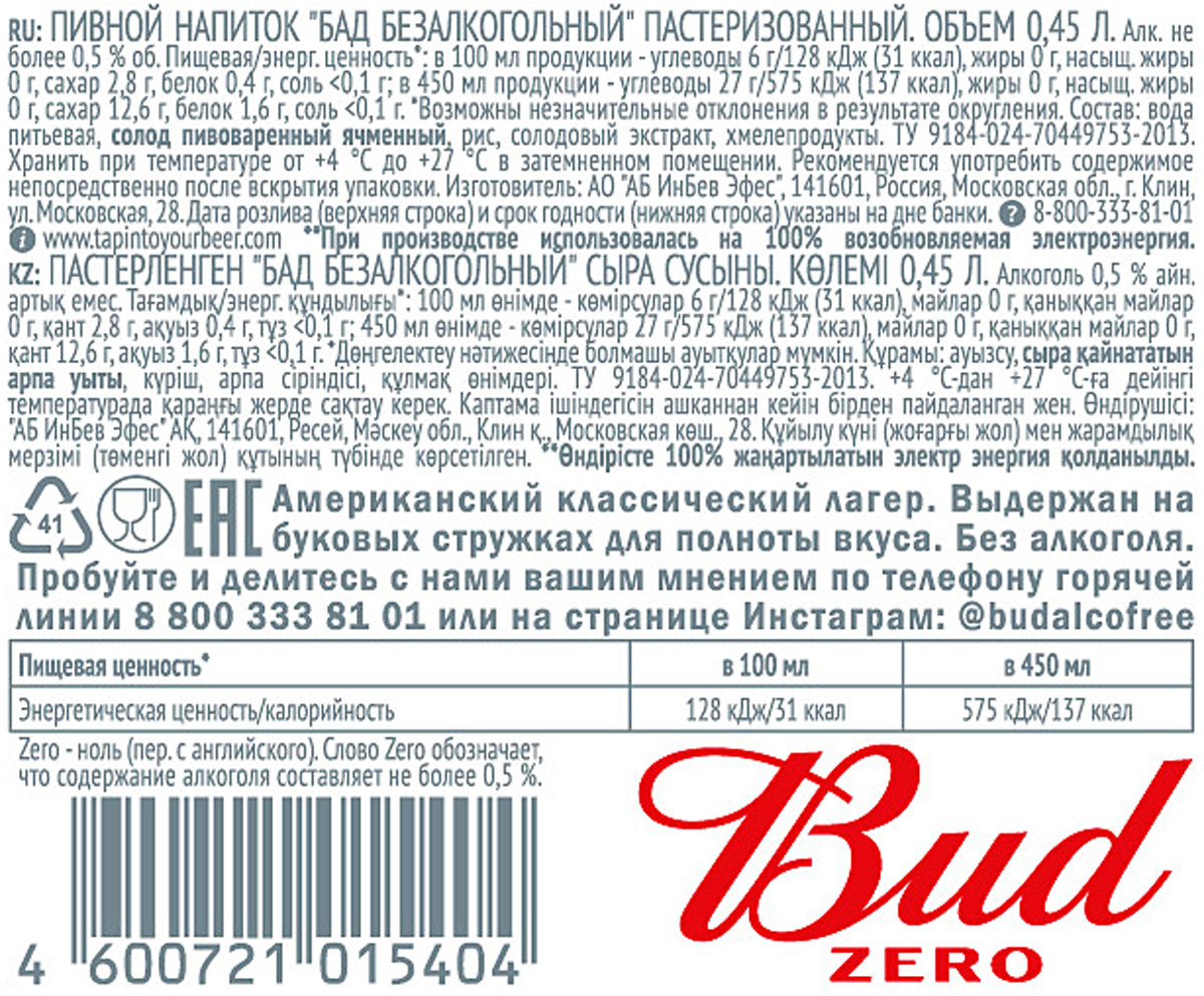 Bud Zero 0.0 безалкогольное светлое