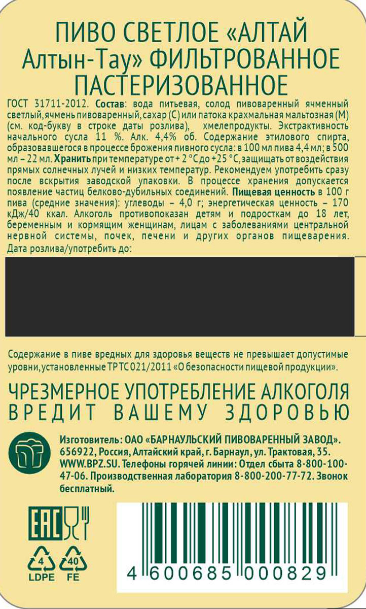 Пиво Алтай Алтын Тау светлое фильтрованное пастеризованное ст