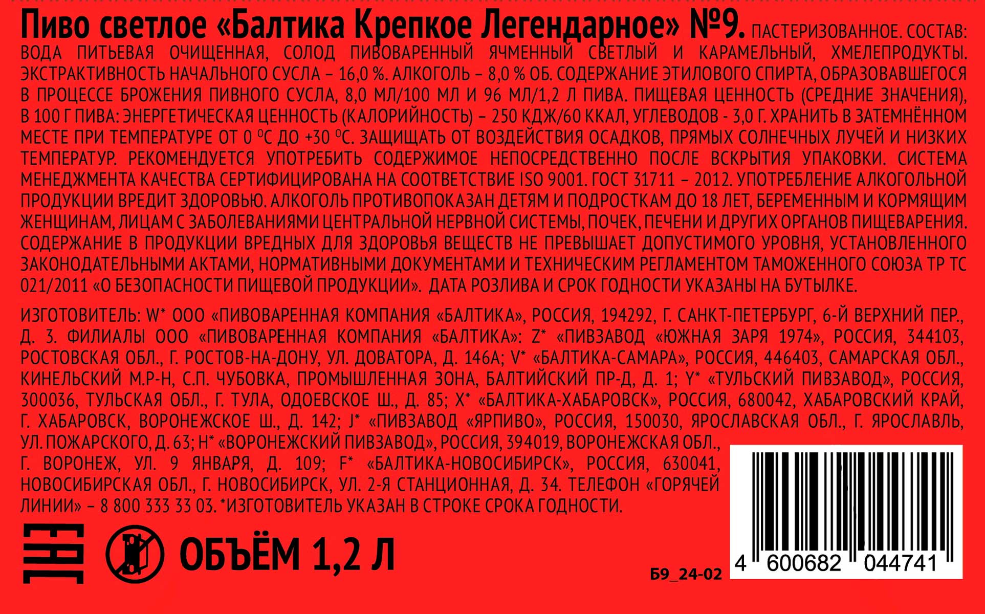 Пиво Балтика №9 Крепкое Легендарное светлое ПЭТ 1,2 л