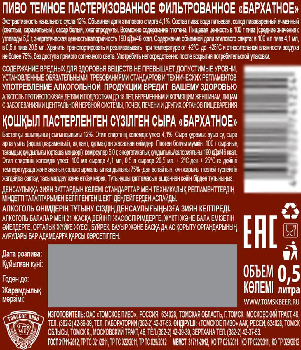 Пиво Бархатное СССР темное фильтрованное пастеризованное ст