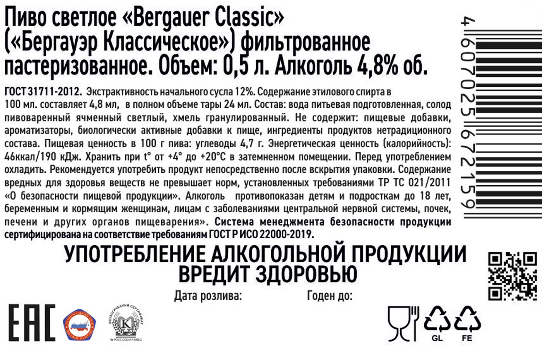 Пиво Бергауэр Классическое светлое ст 0,5 л